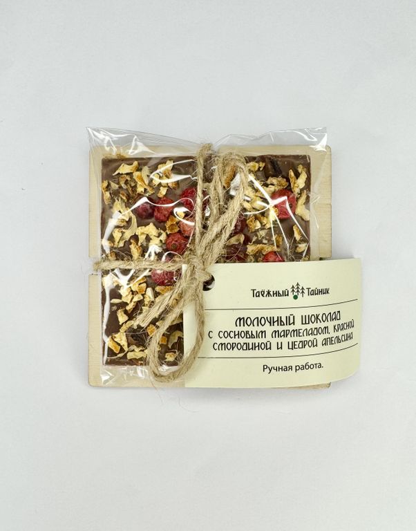 шоколад молочный 34%(сахар, какао-масло, цельное сухое молоко, какао-тертое, лецитин, ванилин), сосновым мармеладом, красной смородиной сублимированной, цедрой апельсина.