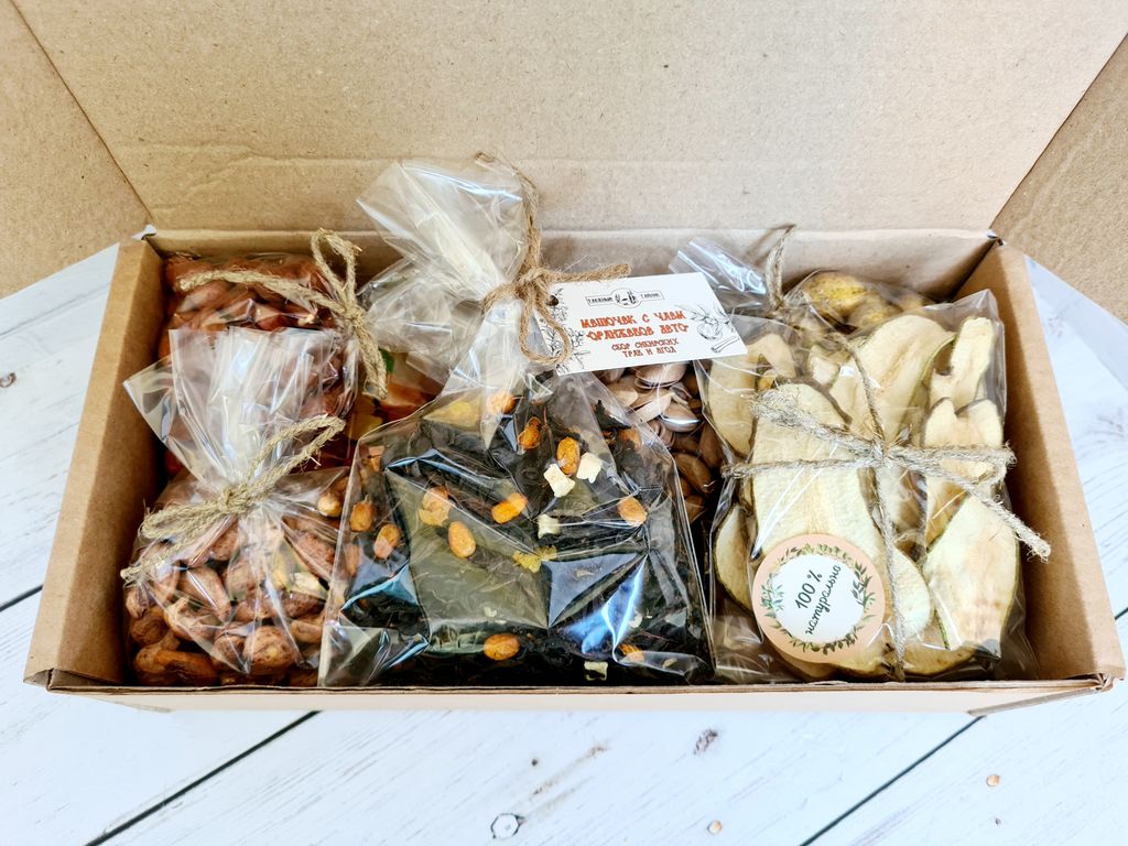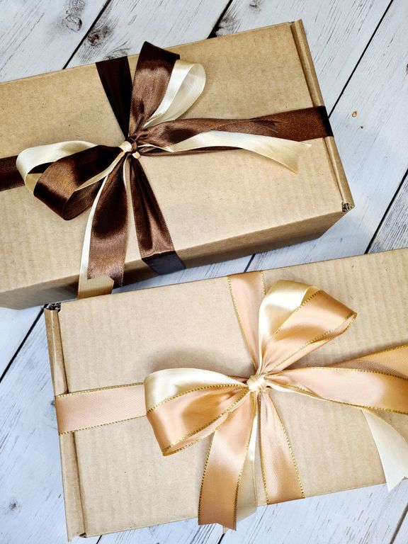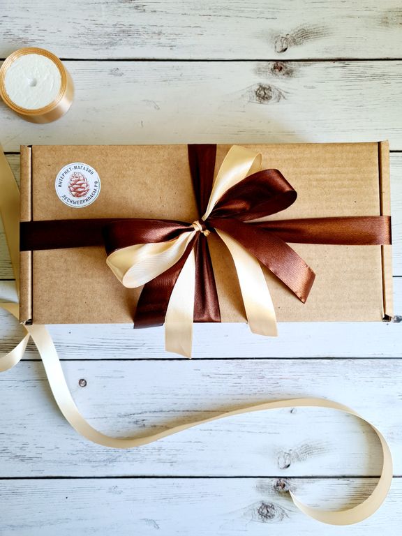 коробка крафтовая+наполнитель бумажный+лента+оформление бантиками внутри.