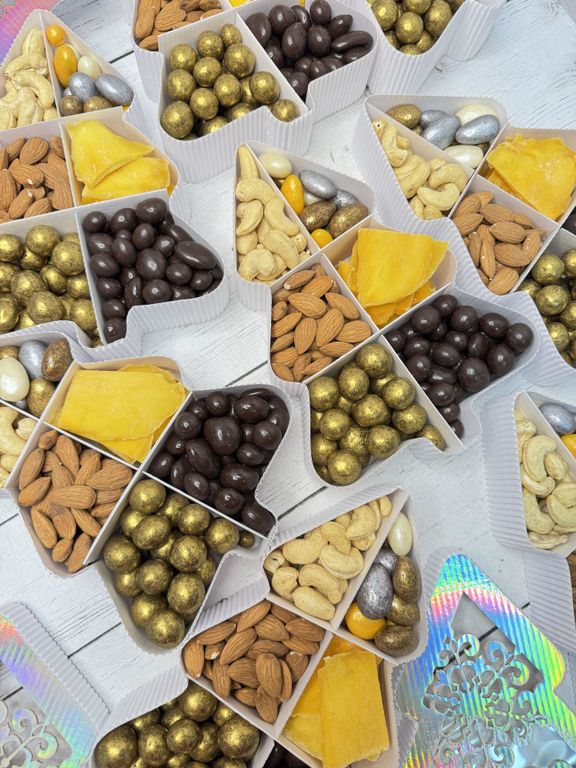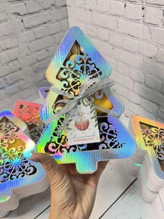 Новогодний набор в коробке в форме елочки, 6 видов орехов и цукатов.
